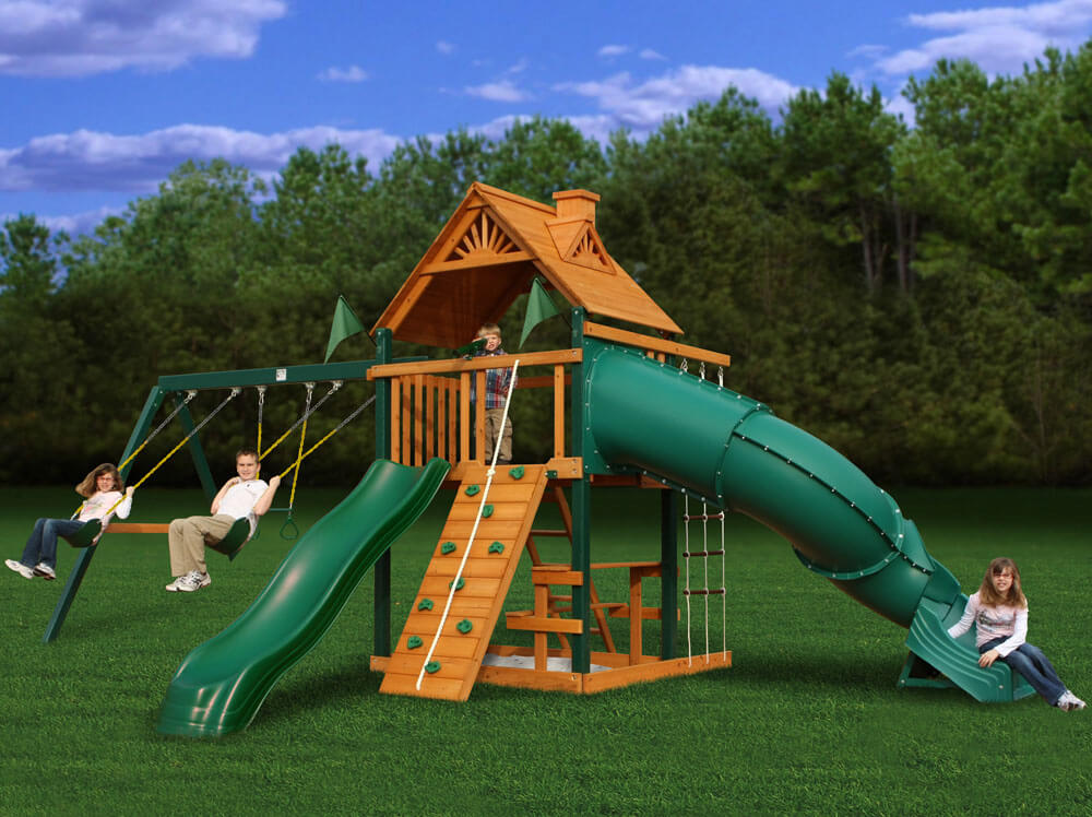 Детская площадка «Альпинист» представляет собой двухэтажную конструкцию. На первом этаже размещены песочница и столик со скамейками. Второй этаж представляет собой закрытое игровое пространство под крышей. Индивидуальный стиль дачной площадке «Альпинист» придает крыша с имитацией слуховых окон и печной трубы.