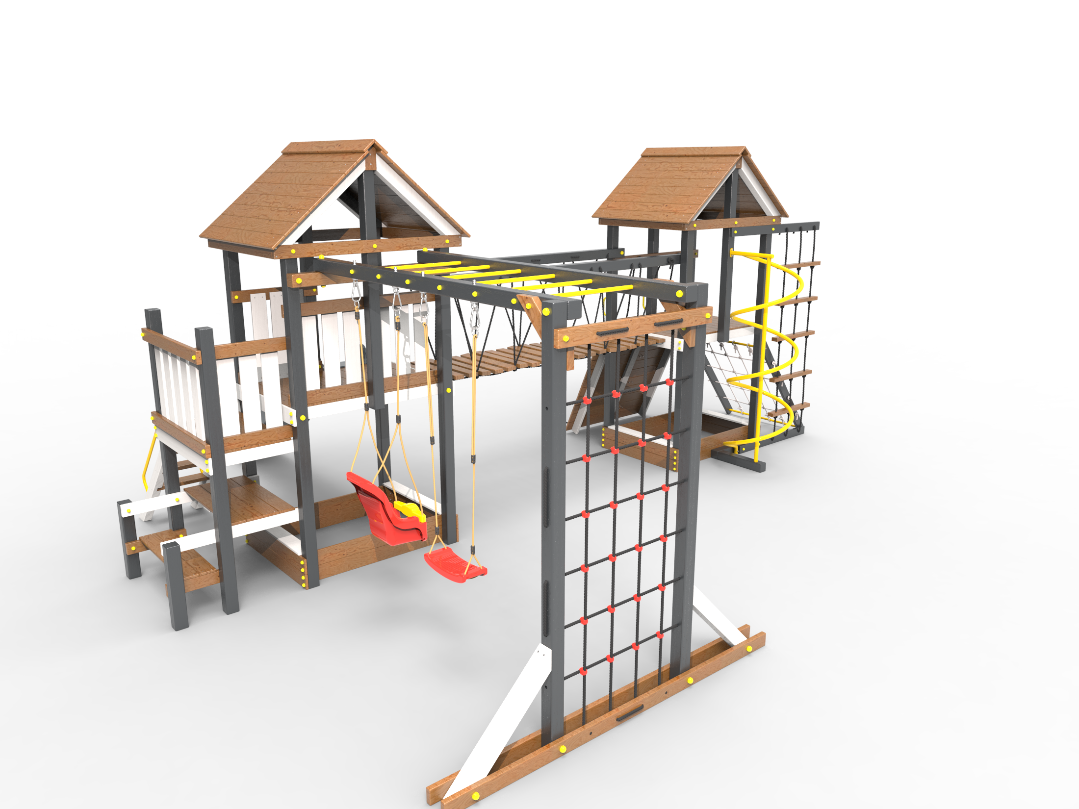 Обращаем Ваше внимание, что фактический цвет детской площадки может отличаться от представленных фото на сайте. Специфика окраски нетоксичными пропитками и красителями допускает отклонения в цветовой гамме отгружаемых изделий. Также обратите внимание, что фактический цвет может отличаться из-за цветопередачи устройства на котором Вы смотрите фото. Производитель оставляет за собой право менять цвет отдельных деталей и комплектующих(включая пластик, канаты и пр.), при этом сохраняя весь функционал и характеристики товара.