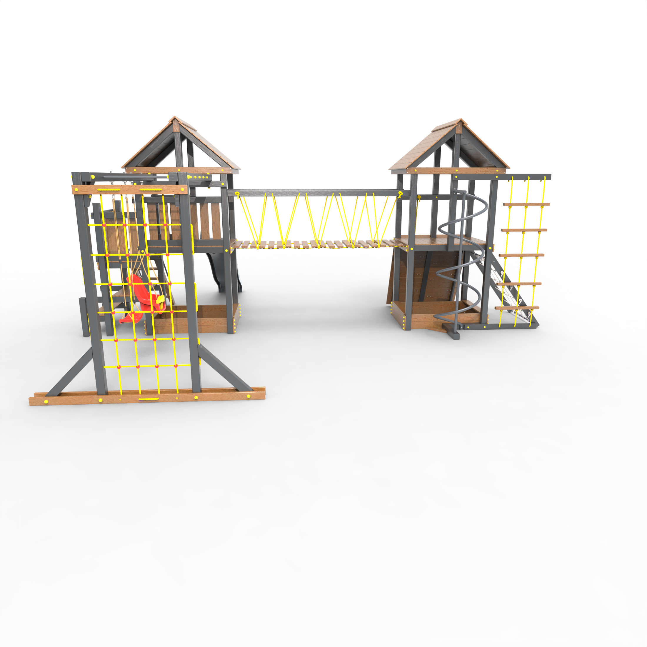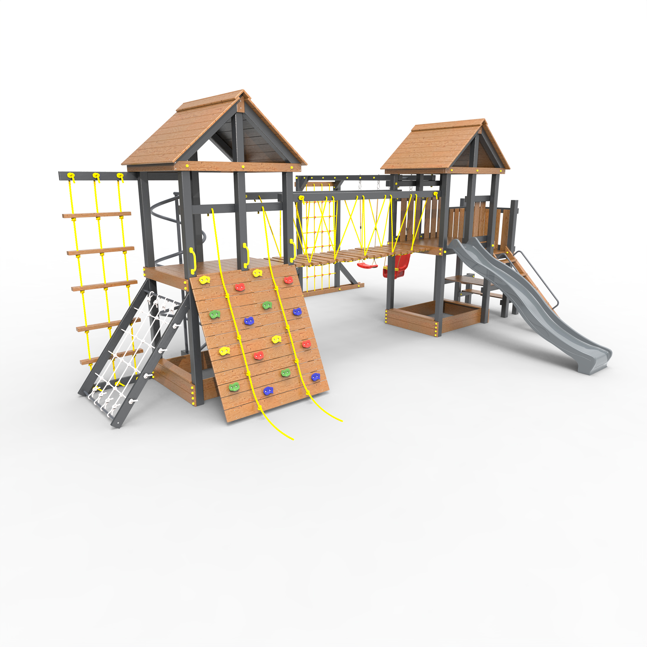 Обращаем Ваше внимание, что фактический цвет детской площадки может отличаться от представленных фото на сайте. Специфика окраски нетоксичными пропитками и красителями допускает отклонения в цветовой гамме отгружаемых изделий. Также обратите внимание, что фактический цвет может отличаться из-за цветопередачи устройства на котором Вы смотрите фото. Производитель оставляет за собой право менять цвет отдельных деталей и комплектующих(включая пластик, канаты и пр.), при этом сохраняя весь функционал и характеристики товара.