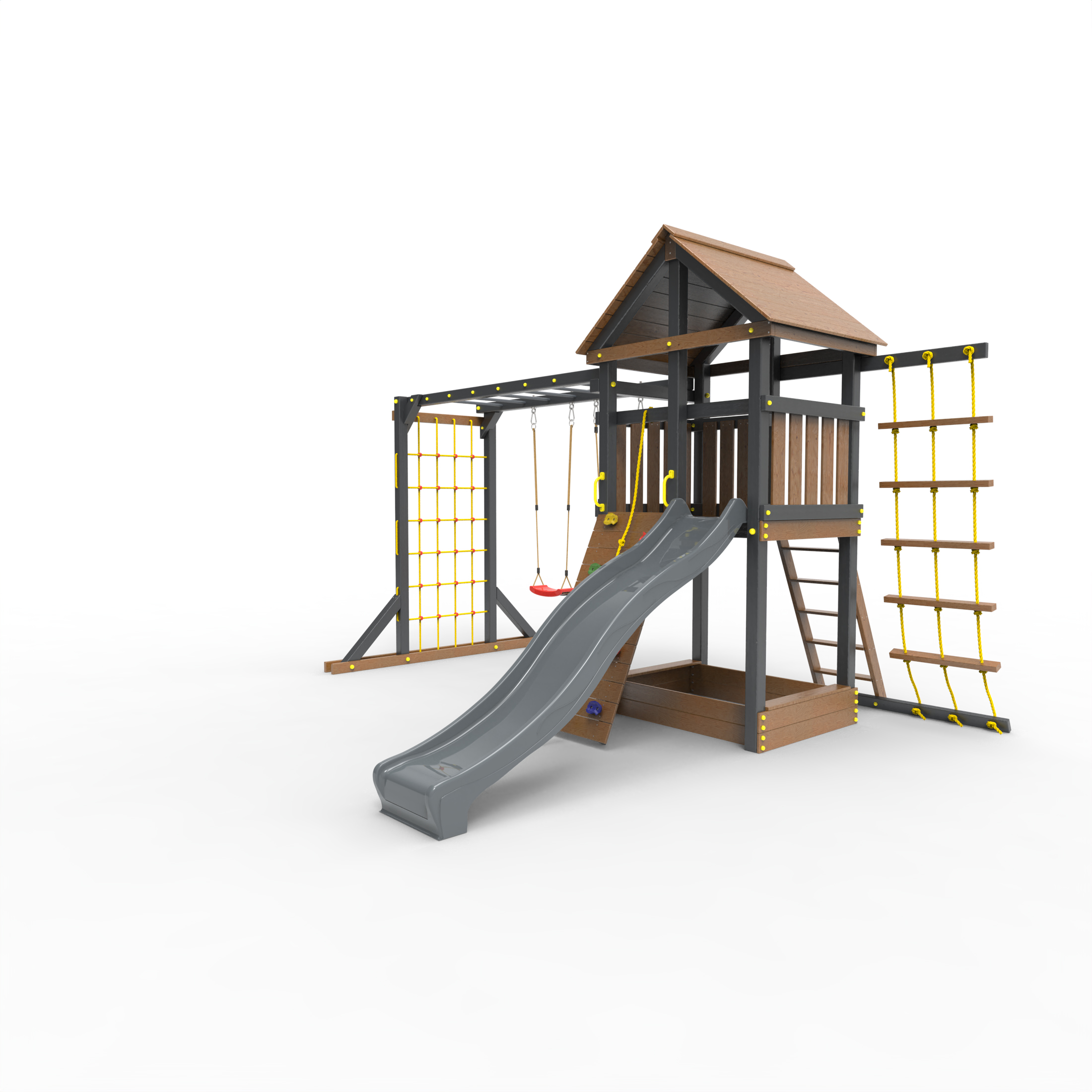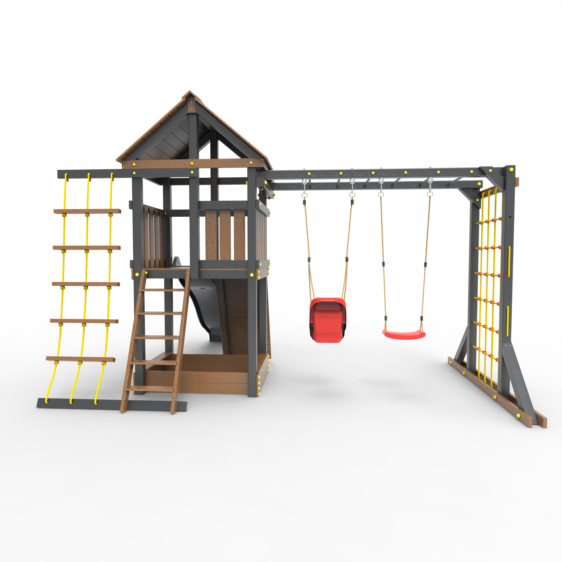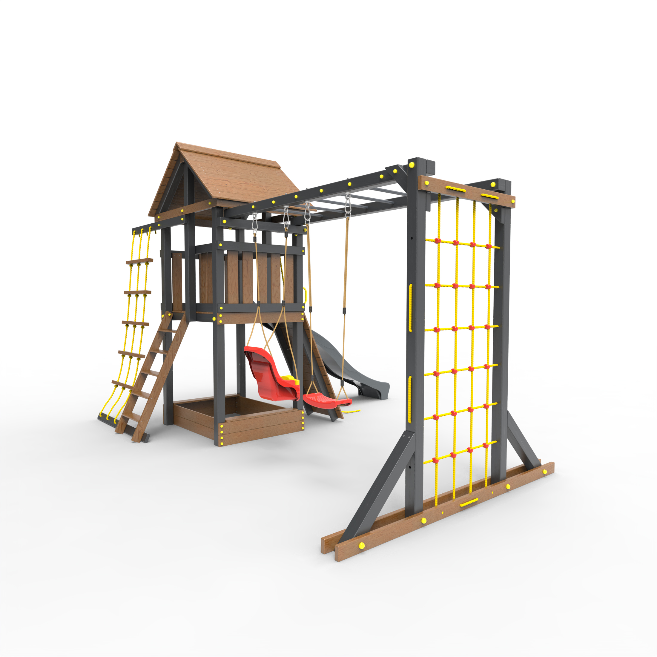 Обращаем Ваше внимание, что фактический цвет детской площадки может отличаться от представленных фото на сайте. Специфика окраски нетоксичными пропитками и красителями допускает отклонения в цветовой гамме отгружаемых изделий. Также обратите внимание, что фактический цвет может отличаться из-за цветопередачи устройства на котором Вы смотрите фото. Производитель оставляет за собой право менять цвет отдельных деталей и комплектующих(включая пластик, канаты и пр.), при этом сохраняя весь функционал и характеристики товара.