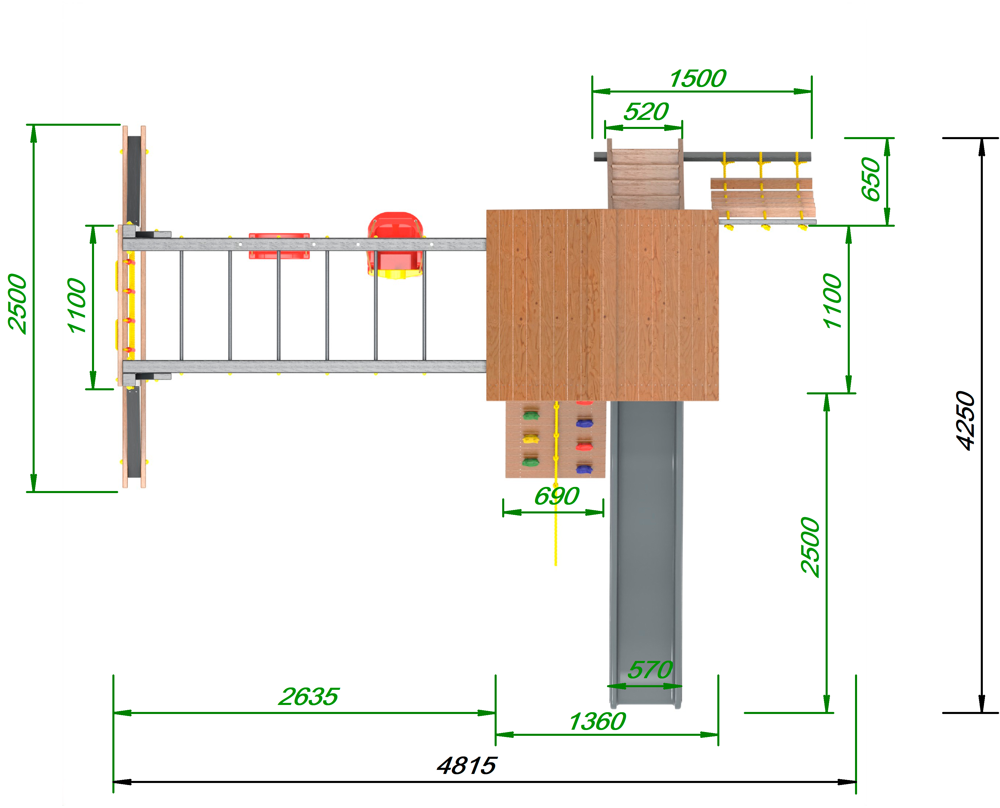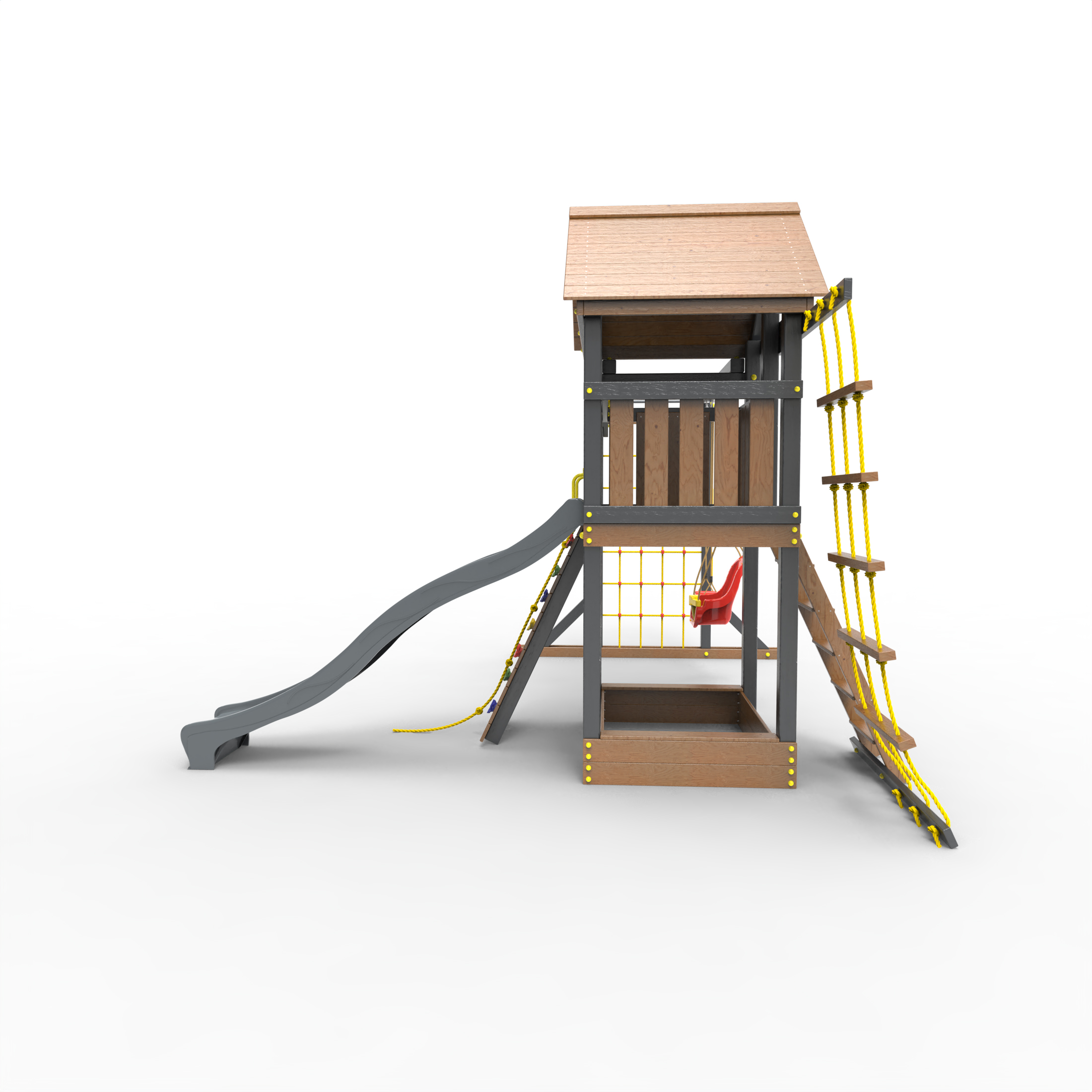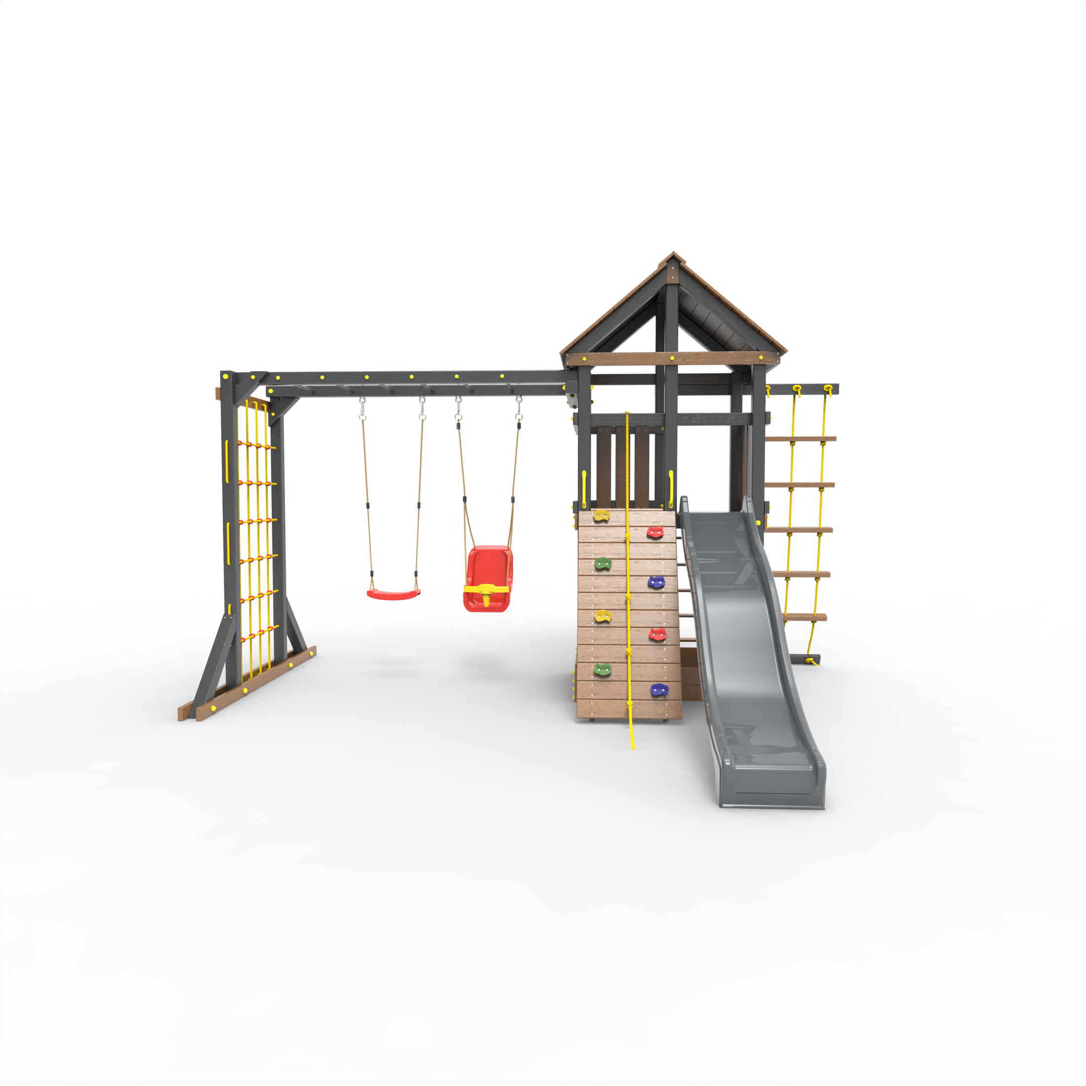 Обращаем Ваше внимание, что фактический цвет детской площадки может отличаться от представленных фото на сайте. Специфика окраски нетоксичными пропитками и красителями допускает отклонения в цветовой гамме отгружаемых изделий. Также обратите внимание, что фактический цвет может отличаться из-за цветопередачи устройства на котором Вы смотрите фото. Производитель оставляет за собой право менять цвет отдельных деталей и комплектующих(включая пластик, канаты и пр.), при этом сохраняя весь функционал и характеристики товара.